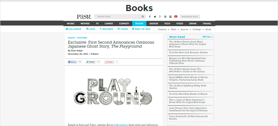 I had the great pleasure of being interviewed by Paste Magazine's Sean Edgar to discuss the announcement of my upcoming graphic novel, The Playground, published by First Second Books. You may read this exchange here: Exclusive: First Second Announces Ominous Japanese Ghost Story, The Playground.