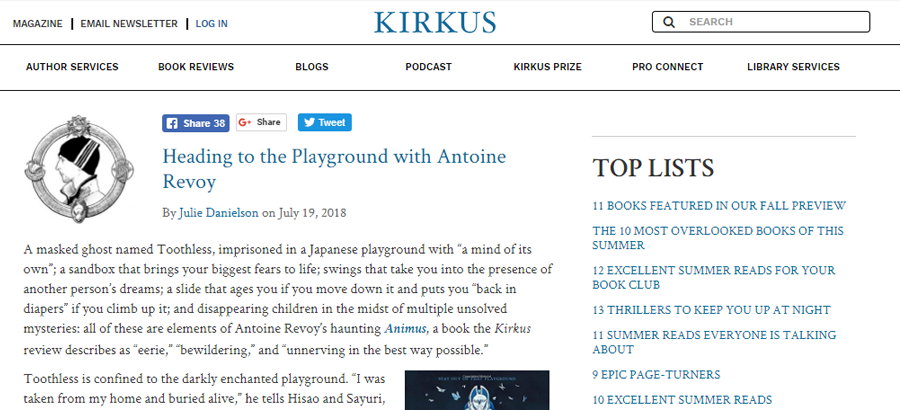 Revoy was interviewed by Kirkus Review's Julie Danielson to discuss ANIMUS in the article "Heading to the Playground with Antoine Revoy."