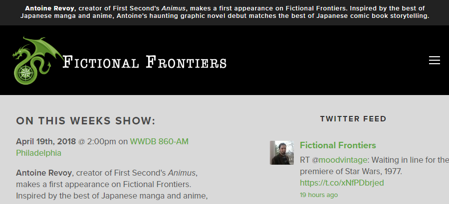 I had the pleasure of discussing the making of ANIMUS, graphic novel writing and more with Sohaib Awan, the erudite host of WWDB 860-AM Philadelphia's wonderful pop culture podcast, Fictional Frontiers.