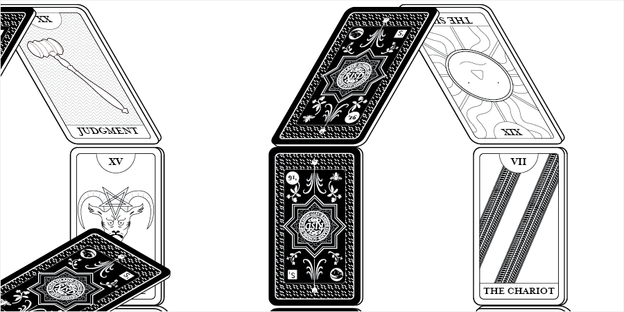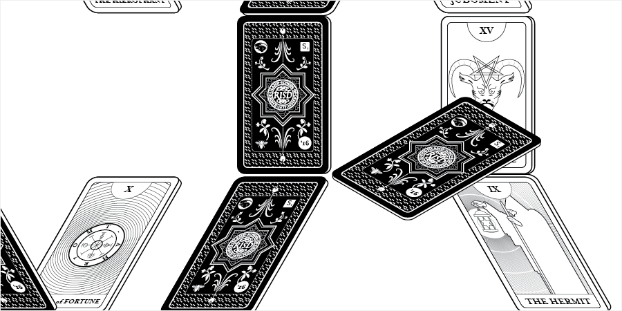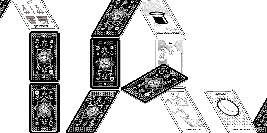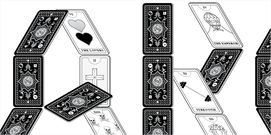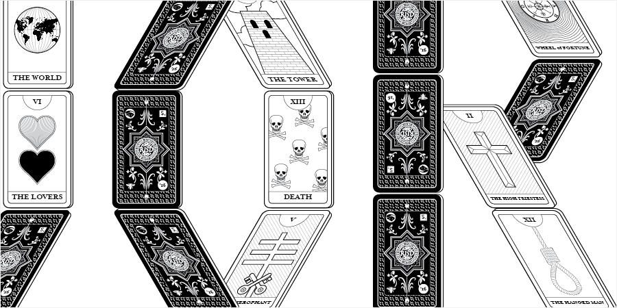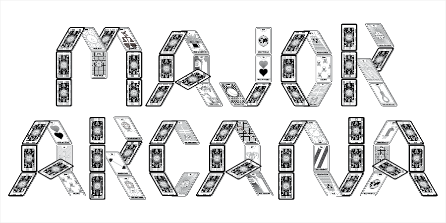 Illustrated type inspired by the Major Arcana (also known as 'trumps') suit of 22 cards in a traditional tarot card deck.