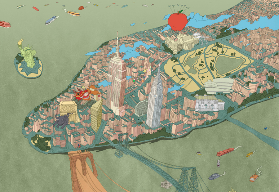 An illustration for Samsonite, a large scale image representing Manhattan for print on hardside luggage. A rush job, most of the line art was executed in a single 16 hour session of drawing.