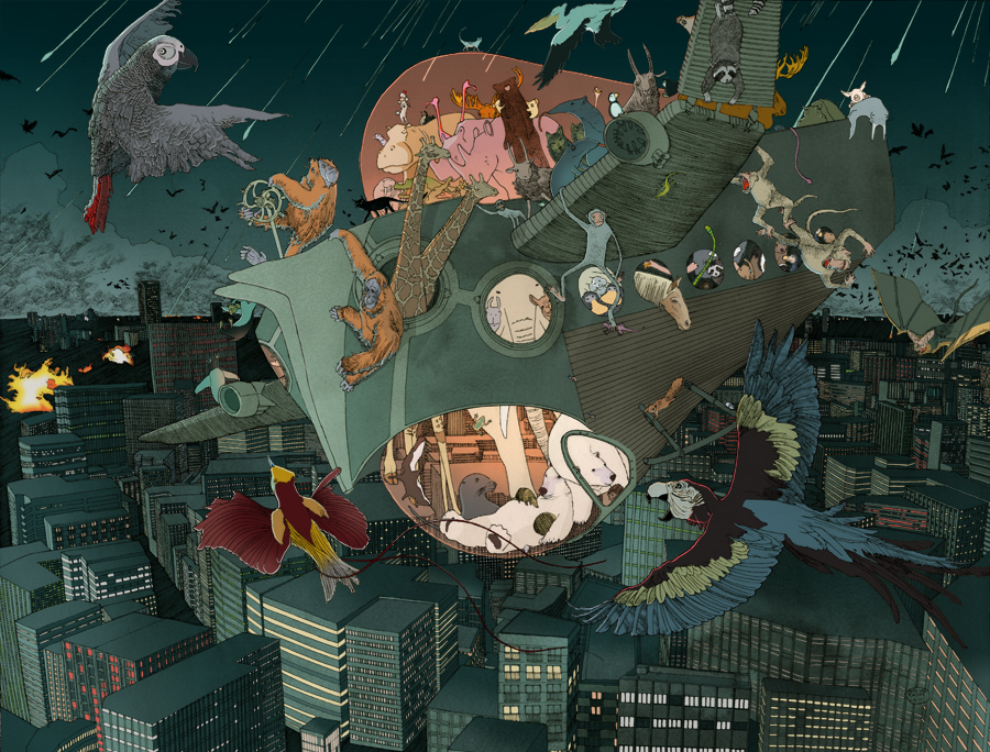 Animals embark on a Noah's Ark to evade a meteor shower.