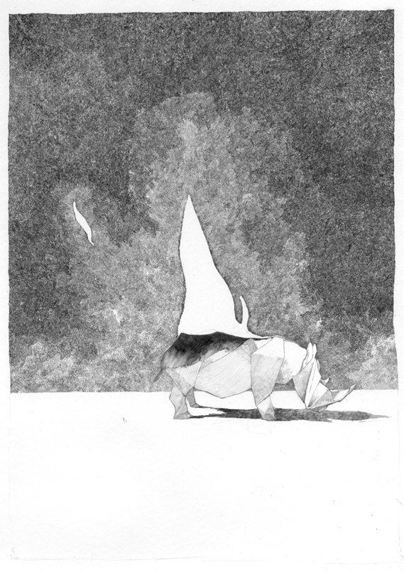 A burning origami to represent the nearing extinction of the rhinoceros.