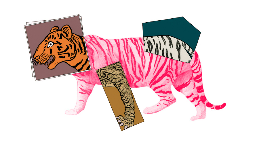 Editorial illustration for an article which I wrote, Moved by Gondry, about film director Michel Gondry's lecture and screening of his latest feature Is The Man Who Is Tall Happy? at the Rhode Island School of Design, in the school's magazine RISD XYZ. This piece illustrates a conversation between Gondry and Noam Chomsky, in which the former attempts to express a modern phenomenon: that he first encountered tigers in images, prior to seeing one in the flesh (or fur).