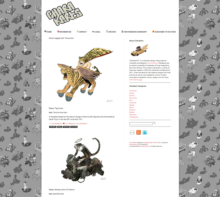 "Charakarts™" is a character design side project by illustrator and designer Antoine Revoy. Charakarts are an eclectic ensemble of characters driving imaginative kart-like vehicles. This project originated in a series of drawings created in 2002 and remained confidential till 2011, when the decision was made to present the initial artwork as well as new charakarts, online. Site styled, customized and managed by Antoine Revoy, who created all of the icons, background patterns and artwork for the website.