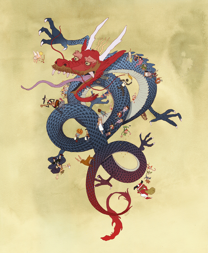 An illustration representing the year 2012 as a dragon's body travelled by multicultural allegories for months of the year (viz. Shichifukujin, Valentine's Day Cupid, El Día de los Muertos, Oktoberfest and more).