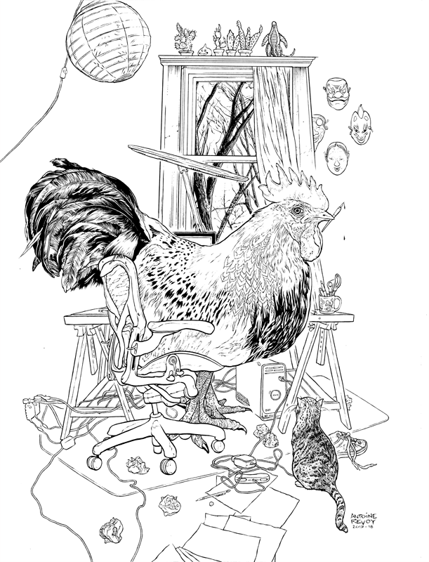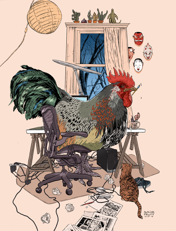 The illustration also represents the long hours I worked on my graphic novel ANIMUS during the year of the Rooster, and features Hobac the found cat.